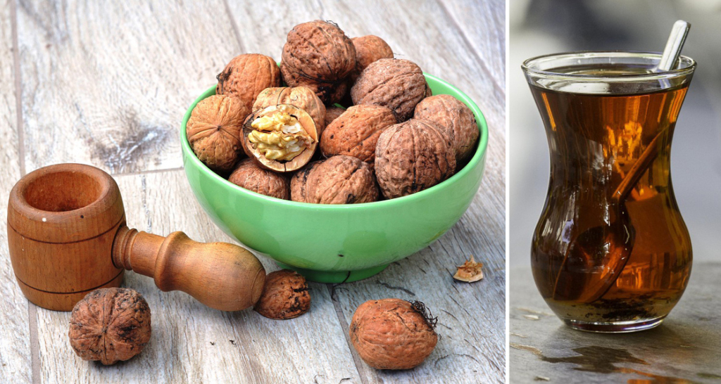 10 Walnüsse waschen und schälen. Dann die Schalen in 1/2 Liter Wasser geben, zum Kochen bringen, dann langsam für 30 Minuten kochen. Bevor Sie den Tee gießen, können Sie ihn nach dem Abschalten für eine Weile einatmen lassen. Sieb durch ein feines Sieb oder Leinwand.Der fertige Tee hat eine Honigfarbe, riecht angenehm und schmeckt gut. Es ist nicht einmal notwendig, Honig hinzuzufügen, wenn Sie Kinder behandeln müssen.