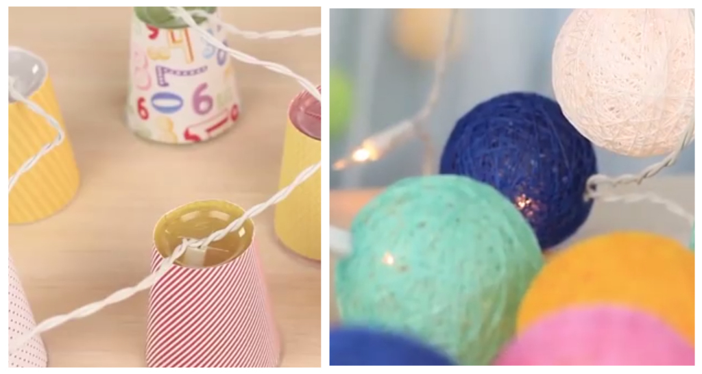 5. PlatzZwischen den Fäden, machen Sie ein kleines Loch, durch das Sie eine Glühbirne aus der Kette in den Ball setzen und Sie sind fertig.Fü