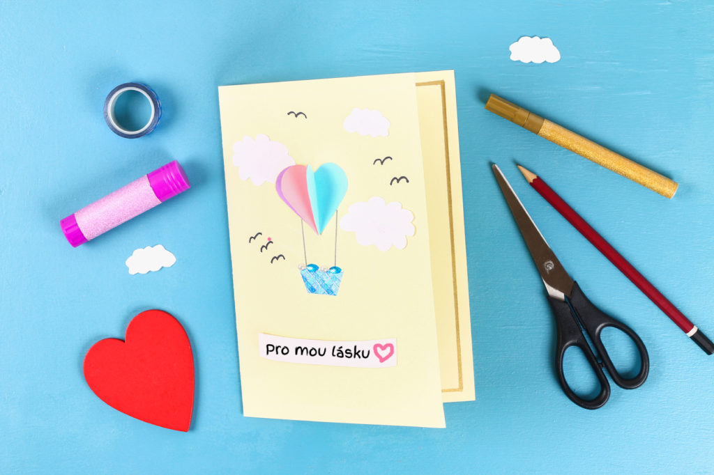 5. S tímto motivem můžete zkusit i malou obměnu. Jen s tím rozdílem, že srdíčkový balon nalepíte dovnitř přáníčka, takže po jeho otevření bude krásně trojrozměrný. Udělejte mu i pěkný rozkládací koš 🙂 A klidně použijte na přáníčko oba balony – navrchu i uvnitř.