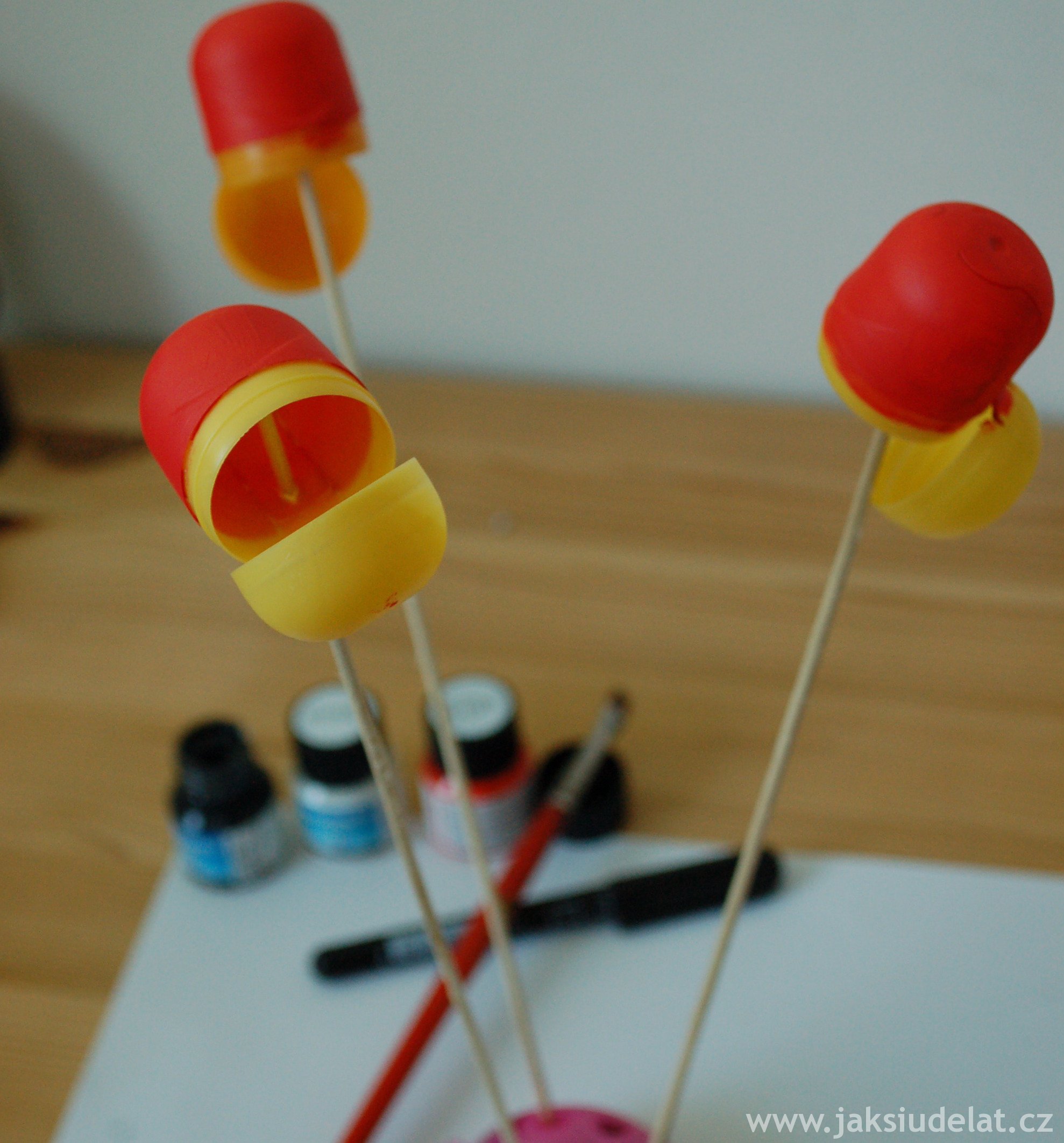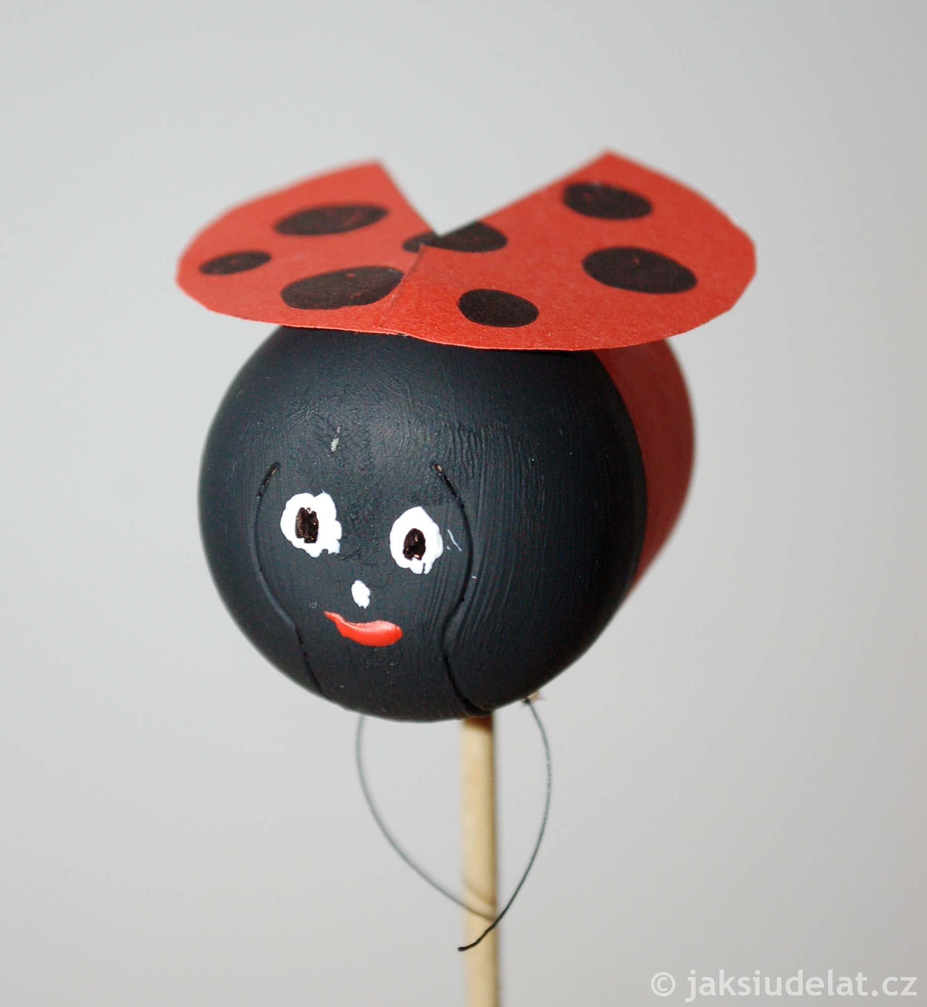 3. Potom natřeme víčko vajíčko načerno a vytvoříme tak hlavičku berušky. Chvíli počkáme, než vše pořádně zaschne, abychom si při další manipulaci barvu nesetřeli. Mimochodem – jako stojan na špejle či štětce se nám při výrobě skvěle osvědčila kostka lega pro nejmenší :-).