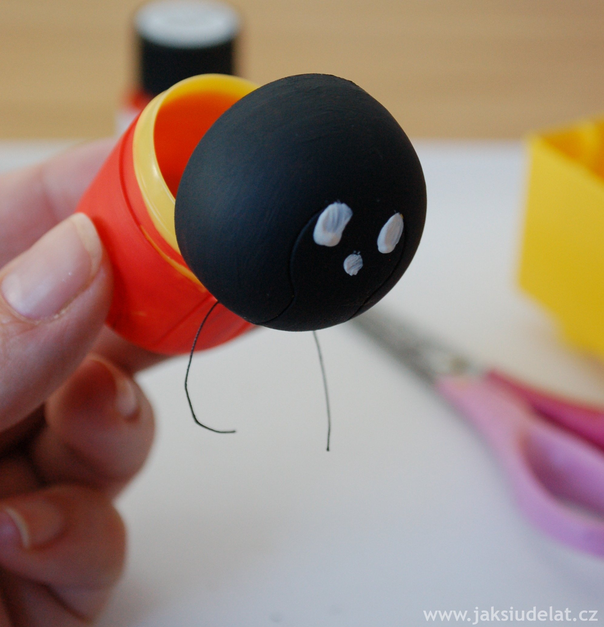 4. Podle fantazie domalujeme obličej. Přes pant otevřeného vajíčka protáhneme ven kousek černé nitě či příze a máme hotové nožičky. Zkrátíme na potřebnou délku.