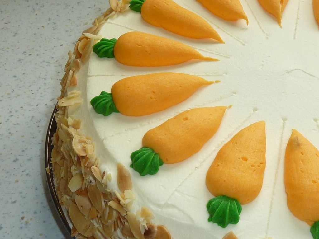 4. Dort nakonec dozdobíme opraženými mandlemi nebo mrkvičkami z marcipánu – ty se perfektně hodí, zvlášť když dort děláte třeba na Velikonoce.